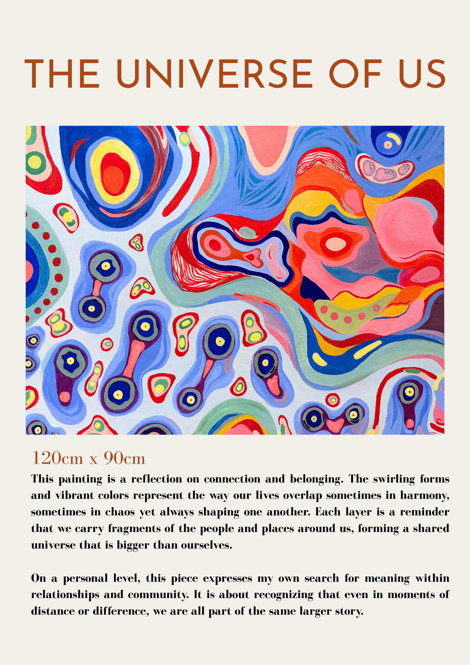 This design began as an original artwork exploring connection, belonging, and shared experiences. Flowing shapes and layered colors reflect how lives intersect sometimes in harmony, sometimes in contrast yet always influencing one another.